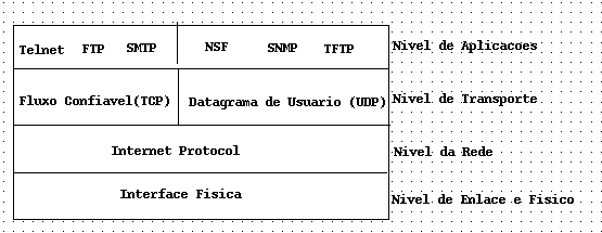Como pode-se observar, na camada de rede TCP/IP tem-se o protocolo IP(Internet Protocol) ; na camada de transporte estão dois protocolos, um que oferece serviços sem conexão, que é o protocolo UDP (User Datagram Protocol) e um outro que oferece serviços orientados a conexão, protocolo TCP(Transport Control Protocol). Na camada de aplicações o TCP/IP tem uma variedade de protocolos de aplicação, como SMTP, TELNET, FTP e NSF entre outros.