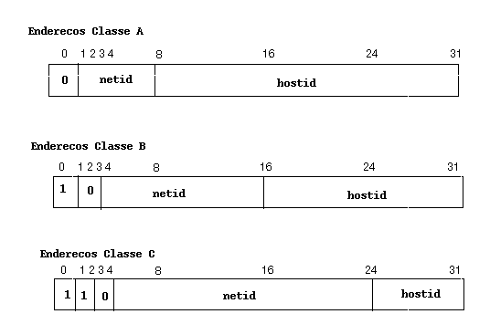 Conceitualmente cada endereço é um par (netid, hostid), onde netid identifica a rede, e hostid identifica um computador nessa rede. Na prática cada endereço IP deve ter um Formato específico. No gráfico abaixo é apresentado o formato dos endereços IP.