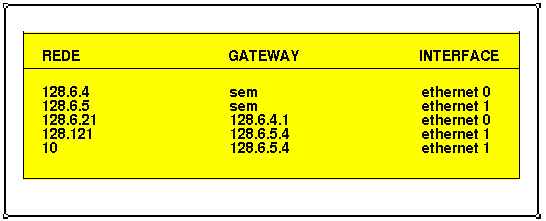 Os pacotes endereçados para estas redes específicas são enviados diretamente ao seu destino, usando para tanto simplesmente a interface ethernet corespondente. Existem dois gateways próximos , que aparecem na tabela 128.6.4.1 e 128.6.5.4 pacotes que sejam para redes diferentes de 128.6.4 e 128.6.5 serão enviados para um ou outro destes gateways, a tabela de roteamento indica qual destes deverá ser usado, por exemplo :