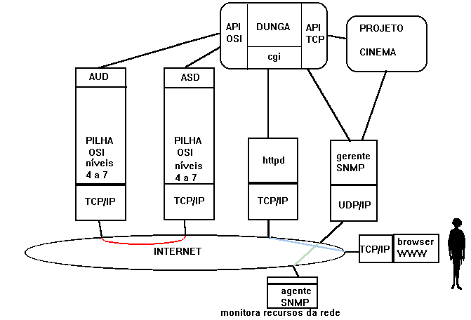 O módulo AUD deverá prover ao usuário final um interface amigável que será implementado usando o interface WWW. Este interface será usado tanto para o cadastramento das informações sobre os usuários da rede (mediante preenchimento de formulários eletrônicos) quando para cesso a todas as informações que serão disponibilizadas pelo sistema DUNGA. Isto permitirá gerenciar o uso da rede pelos diversos grupos de usuários (quem está cadastrado em que sistema, consome quanto, em que serviços etc...).