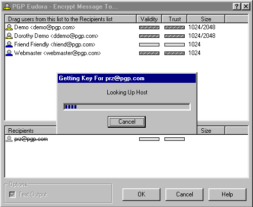 Quando ela tenta enviar a sua mensagem, o PGP 5.0 localizará rapidamente a chave de um