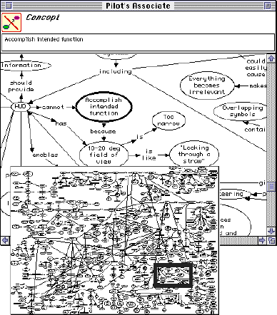 Computer support also makes it possible to manage very large concept maps that are difficult to manage in paper form. The upper window of Figure 4 shows part of a map with some 900 nodes that was originally developed on large white boards from US Air Force pilots as part of the knowledge acquisition process for the design of the pilot's associate expert system (McNeese et al., 1990). It took 6 person-hours to enter this entire map from the printouts in the report cited. An auxiliary helper window at the bottom shows the whole map in miniature with a rectangle at the lower right scrolling with the upper window to indicate the location in the total map of the part being viewed and edited. A "fit-to-screen" command may be used to display the entire map in the editing window also so that large parts of it may be moved or copied and pasted in one operation. In general, such large maps are usually partitioned into small modules that are linked through hypermedia links such as those as illustrated in Figure 3. However, if required, large maps are readily managed through a computer support system.
