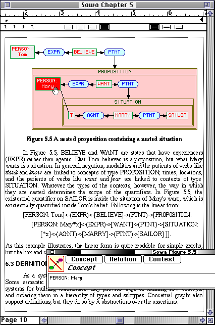 Figure 6 shows a conceptual graph from an article by Sowa (1991b) embedded as active hypermedia object within the article using an active document technology that allows the map to be edited within the document processor and interrogated by other programs as a formal knowledge base (Gaines and Shaw, 1993b). The graph represents the English language statement that "Tom believes that Mary wants to marry a sailor." It may be translated automatically into the linear, textual form of conceptual graphs as shown beneath it, and both diagram and textual form may be translated into predicate calculus. The textual form can also be loaded into the PEIRCE (Ellis and Levinson, 1992; Ellis, Levinson and Robinson, 1994) inference engine for conceptual graphs, and queried as a deductive database.