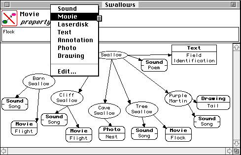In most applications the node types are set up in advance, and the end user of a concept map has available a preset system of node types. However, the node type editor is available and the types and their appearance can be edited during ongoing development of a concept map if required. Figure 10 shows a concept map in a multimedia information retrieval system with the user selecting the type "Movie" on a popup menu prior to adding a new node. The visible content is entered by typing it into the text editing box under this menu. The invisible content is entered by double clicking on the node to edit it while holding down the "option" key on the Macintosh. KMap normally automatically word wraps the visible content to form a horizontal rectangle but this can be overridden by the user inserting the paragraph marker symbol, [[paragraph]], to indicate line breaks.