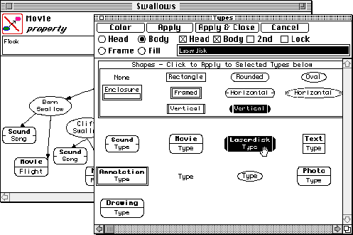 The user interface through which the types of nodes may be selected is itself customizable. In Figure 10 types are accessed through the two popup menus at the top left. Two menus are provided because node types often divide naturally into two types, for example a "node type" and a "link type" with the constraint that nodes whose type is in one class may be connected by arcs only to nodes whose type in the other. The concept maps in Figures 1, 3 and 6 have such a bipartite structure.