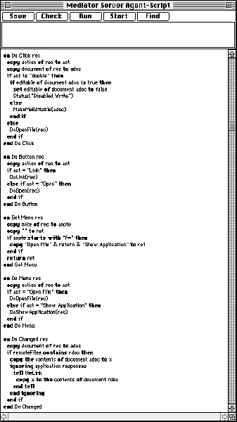 KMap is itself programmable through the Apple high-level object event protocol (Apple, 1993a), and can be driven by any of the scripting languages in Apple's open scripting architecture such as AppleScript (Goodman, 1993), Frontier (Winer, 1992) and TCL (Ousterhout, 1994). Each concept map can have its own script which receives messages triggered by user interaction with the concept map. This enables KMap to be integrated with other applications, and user interaction with graphical structures in the visual language to be used to control any activity supported on the host computer or network. The development of a specific system involves writing scripts to provide the required functionality by drawing upon existing applications. Figure 12 shows part of the script associated with a server agent in the Mediator (Gaines and Norrie, 1994) collaborative system opened for editing.