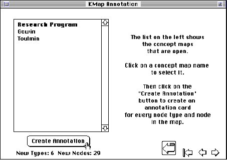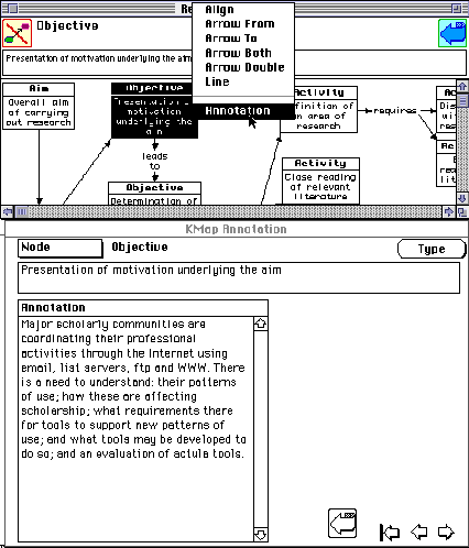 The card shown in Figure 13 maintains a list of concept maps open in KMap--those of Figures 1 through 3. Selecting one of these in the list and clicking on the "Create Annotation" button causes HyperCard to create a preformatted annotation card for every type and every node in the concept map. Figure 14 shows a popup menu being activated for one node in the graduate research concept map of Figure 3. The access to HyperCard has given the menu an extra option at the bottom, "Annotation", and selecting this causes the HyperCard stack to come to the front displaying the annotation card for that node. If a card for the node did not already exist, one would be created thus allowing annotation for a new node to be entered very simply. The student may enter textual annotation into a scolling box on the left, and populate the rest of the card with other relevant material, such as images and buttons linking to other cards.
