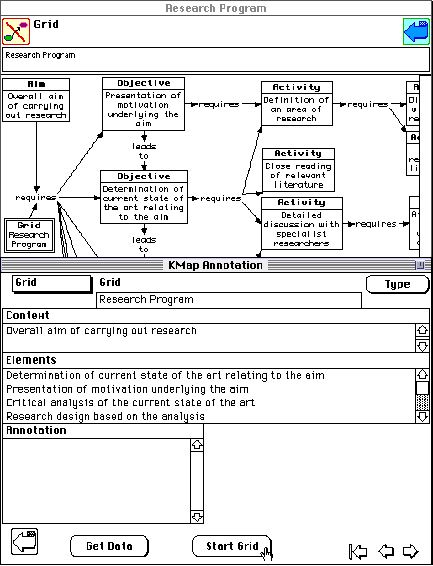 The node type "Grid" has been predefined to have a special annotation card with associated scripts. The user has entered a "Grid" node at the middle left of the concept map and linked it to the relation node "requires" which itself is a link from the concept "Overall aim of carrying out research" to a list of requirements. It is this list that makes an interesting set of elements to be distinguished along various dimensions using repertory grid elicitation. When the user selects the "Annotation" option for the "Grid" node, the HyperCard stack is programmed to generate the specialist annotation card shown at the bottom of Figure 5.