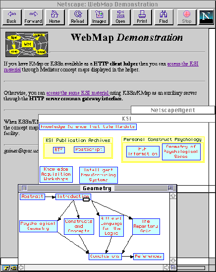 The scripting capabilities make it possible to operate KMap as a WWW client helper, capable of accepting concept maps brought across the web by a browser such as Netscape, and of requesting arbitrary files, including concept maps, to be fetched through messages sent from KMap scripts to the WWW browser. Figure 25 shows an HTML document in Netscape which has links to KMap documents. When the user clicks on the hypertext link "access the KSI material" at the top of the screen, Netscape fetches a KMap file "KSI" which it passes to KMap which opens and displays it as shown in the KMap window at the middle right.