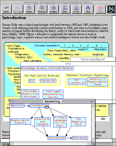 Clicking on the node "Geometry of Psychological Space" at the right of this concept map causes KMap to send a message to Netscape requesting that the file with uniform resource locator (URL) "http://ksi.cpsc.ucalgary.ca/WebMap/Geometry.KSS" be fetched. This is a concept map of the structure of an article provided by its author that opens in another KMap window shown at bottom right. Clicking on the node "Introduction" at the top of this concept map causes KMap to send a message to Netscape requesting that the file with URL "http://ksi.cpsc.ucalgary.ca/PCP/PCPIntro.html#3" be fetched. This is a section of an HTML document that Netscape then displays in its own window as shown in Figure 26. Clicking on other nodes in the concept map causes Netscape to navigate to different sections of this document.