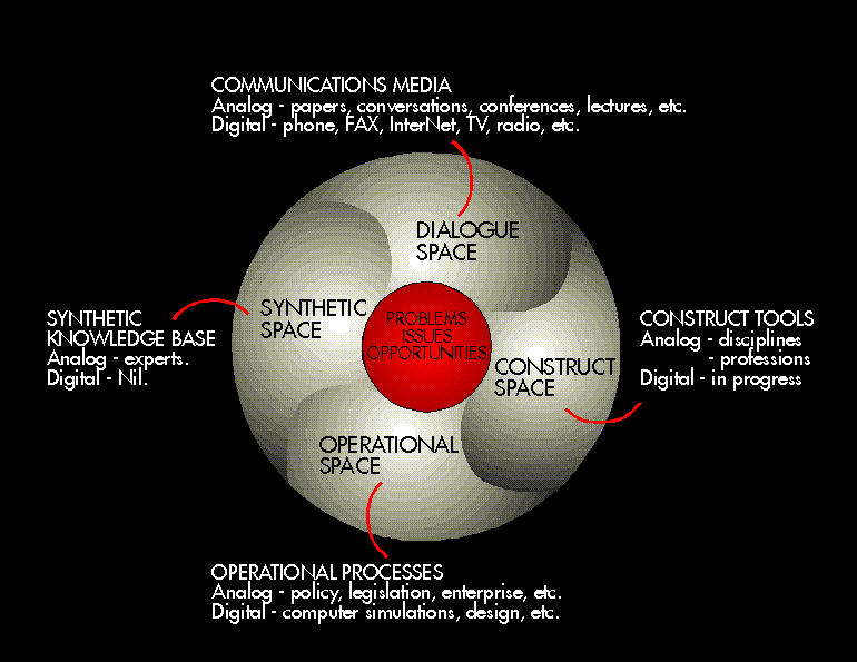 A knowledge mapping cycle will nearly always involve these 4 contiguous spaces, and most problems and issues will require a large number of iterations. The process is also typically non-monotonic within and between cycles, unless the problem or issue is straightforward. Emphasis, in terms of focus within one, or less than all, of the spaces can also be expected, depending on the nature of the knowledge mapping process (i.e., intra or multidisciplinary). On the other hand, hybrid processes resulting from matings between a number of narrowly focused processes may begin to define transdisciplinary knowledge. The knowledge maps which result should ideally contain a record of all such interactions to enable independent validation and androgogy. But before any of this can be expected to occur, there is some need to understand what would drive the knowledge mapping model being proposed here.