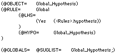 Figure 10 shows the top level control rule generated. It uses the class of Rules defined in Figure 9 in a pattern-matching clause that tests whether the hypothesis of any rule is true. The global hypothesis of this rule is also put on the list of suggestions in the shell so that this rule may be triggered very simply.