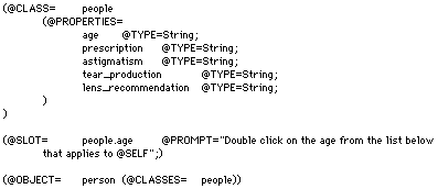 Figure 11 shows the class definition that transfers the primary knowledge structure about the class of cases defined by the dataset. It is followed by meta-slot definitions, of which one is shown, giving the prompts that the shell should use in requesting the values of attributes. These are followed by the instantiation of one object in the class that may be used as a test case.