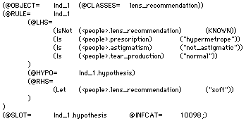 The meta-slot INFCAT (inference category) of the hypothesis for the rule is set in the final line to 10098. This is generated from the probability of the rule being correct times 100 plus the lowest priority of the attributes tested in the left hand side of the rule (98 for the expensive to test attribute, tear production--rest are set to 99). When executing the top level control rule defined in Figure 8, the shell prioritizes the pattern-matching based on the value of this meta-slot, testing hypotheses with the highest values first. Thus rules with the greatest probability of being correct are tested first, and among those of equal probability the ones that require the values of only higher priority attributes are tested first.