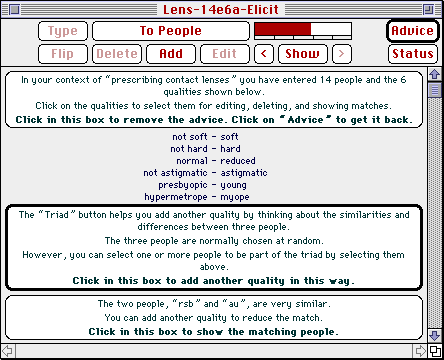 The screen in Figure 10 shows a list of the constructs so far elicited, and various options available to the user to select her next task. The advice boxes can be turned off for an experienced user, or the next most sensible task chosen by clicking on the Advice button. Each button shown in the top part of the screen gives the user a different option.