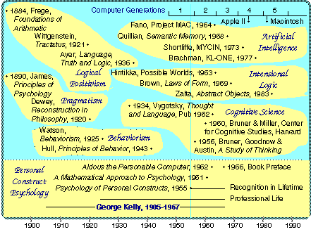 Personal construct psychology can be seen to be an heir to European logical positivism and American pragmatism, taking an alternative path to behaviorism that is similar in many respects to what later became termed cognitive science. In this Kelly was preceded by Vygotsky in the USSR whose book Thought and Language appeared in 1934 but was suppressed until 1962 (Wertsch, 1985; Vygotsky, 1989). Luria, who had been a student of Vygotsky invited Kelly to Moscow in 1961 where he delivered a particularly clear statement of the formal principles of personal construct psychology in the light of reactions to his earlier book (Kelly, 1969). Kelly was working on a second book when he died of which, unfortunately, only the preface has been published (Kelly, 1970), and he also began to become involved with the computer simulation of personality (Kelly, 1963). However, his work never became part of the mainstream cognitive science literature although it has attracted widespread attention and application in management, education and clinical psychology (Shaw, 1981).