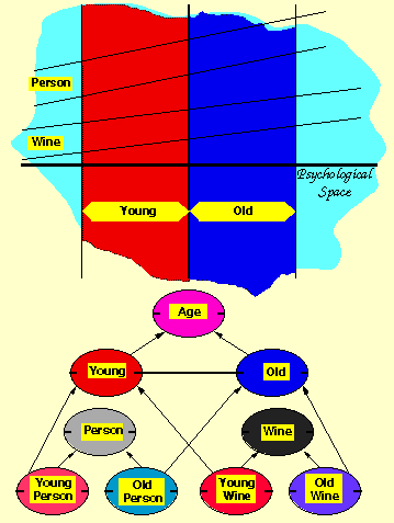 Multiple constructs in psychological space correspond to multiple axes of reference, and the plans representing their distinctions and ranges of convenience intersect to define regions of the space corresponding to conjunction, composition and multiple inheritance in the logic as shown in Figure 6.