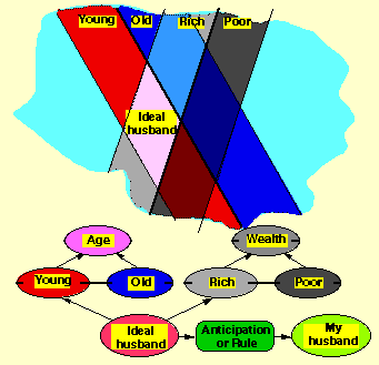 The logic remains intensional because there is no implication that elements have already been construed within the intersections. Kelly often explained a construct in terms of how elements were placed, but he does not define a construct as necessarily having elements placed along the axis. Elements are placed in the framework of existing constructs, or the construct system is adjusted to account for a new element. For example, in the marriage anticipation example given above, the predicted husband `exists' only as the "intersect of a limited number of conceptual dimensions." The attachment of an anticipation to this intersect corresponds to a commitment to place an element that falls in this intersect in the region defined by the pole of some other construct also. In logic this is a material implication rather than an entailment in that it is not necessitated by the way in which the distinctions are defined but is instead an auxiliary commitment or rule.
