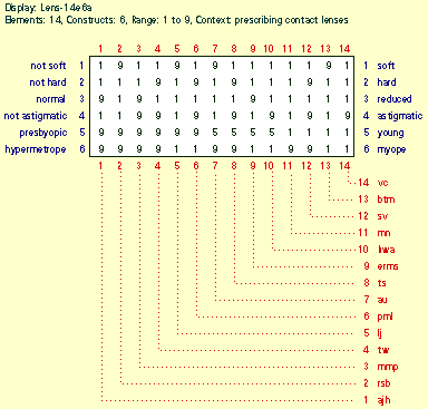 Figure 11 shows a principal components analysis of the contact lens data. It is reminiscent of Kelly's model of psychological space, and that may be one reason for the popularity of such analyses. Each construct is represented by a dimension on the two axes explaining the most variance in the construct system. The elements are located in this space. We can see the two main construct clusters, one being astigmatic -- not astigmatic, hard -- not hard, and not soft -- soft. These later turn out to be the rules for prescribing lenses, the others specify the exceptions. An alternative form is the FOCUS analysis which shows the beginnings of the development of the logical hierarchical structure in space.